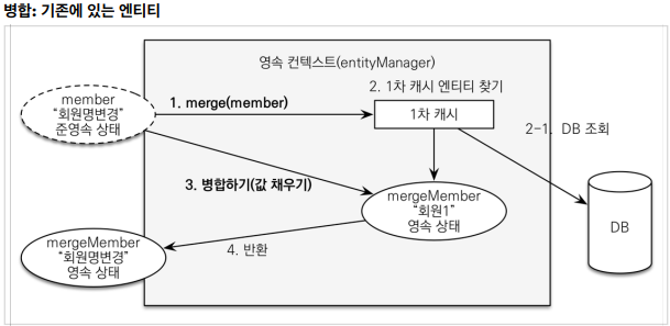 주의! 변경 감지 기능을 사용하면 원하는 속성만 선택해서 변경할 수 있지만 , 병합을 사용하면 모든 속성이 변경된다. 병합 시 값이 없으면 null로 업데이트할 위험도 있다. (병합은 모든 필드를 교체한다)