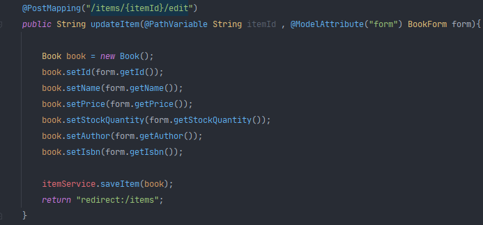 HTML Form에서 가져온 BookForm form의 데이터를 담은 "book" 객체가 왜 준영속 엔티티일까?